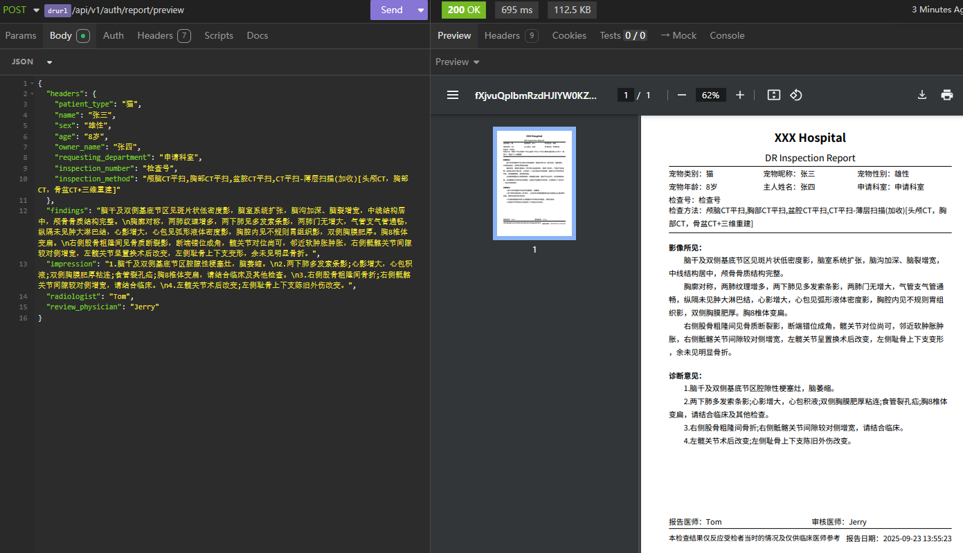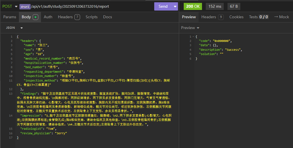 参数名称 数据类型 默认值 不为空 描述 headers object true ⇥ name object true 姓名 ⇥ sex string true 性别 ⇥ age string true 年龄 ⇥ medical_record_number string true 病历号 ⇥ hospitalization_number string true 住院号 ⇥ bed_number string true 床号 ⇥ requesting_department string true 申请科室 ⇥ inspection_number string true 检查号 ⇥ inspection_method string true 检查描述 findings string true 影像所见 impression string true 诊断意见 radiologist string true 报告医师 review_physician string true 审核医师 响应体